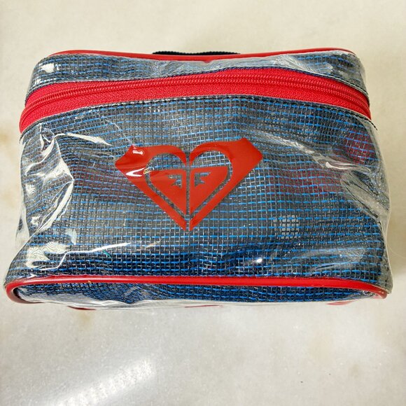 This Vintage Roxy Make-Up Bag has never been used. It is clear plastic with a navy mesh inside, a red zipper closure and, a handle of navy with ribbon center accent. The measurements are 8 inches wide, 5.25 inches across, and 5 inches deep. Excellent condition.