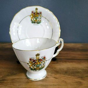 This Royal Adderley Arms of Canada footed teacup & saucer is a perfect addition to any tea cup collection. Crafted from bone china, it features a Canadian crest decor and a sophisticated gold trim. Made in England, it has a capacity of 6 fl. oz.