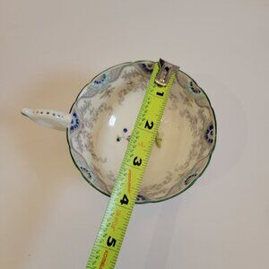 This elegant Royal Albert cup and saucer set is crafted from fine bone china and adorned with a delicate floral pattern, adding charm to any collection.
