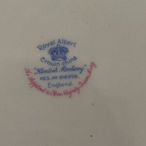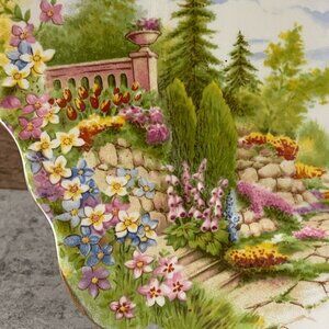 Square scallop edge gold rimmed cake plate in the Kentish Rockery pattern which shows a beautiful flowering garden in an English countryside landscape. Marked on the back with 'As Supplied to Her Majesty Queen Mary' which dates this to about the 1940s.