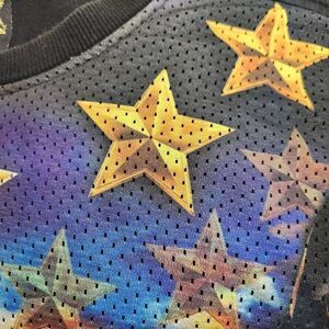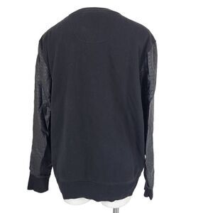 Awesome vintage Royal Army long sleeve top. Front has stars and eagle overlooking city print with perforated detail. Long croc embossed black sleeves. Lined.
