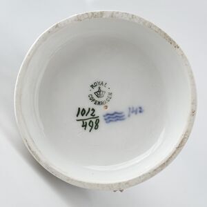 This charming Royal Copenhagen figurine features a faun or young satyr gently interacting with a playful goat. The sculpture beautifully captures the mythical warmth and curiosity of childhood, rendered in soft earthy tones with a glossy finish. The base features a classic interlacing border design that adds a refined touch.