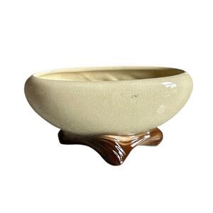 Vintage Royal Copley Footed Cream Oval Planter Vase with Green Leaves