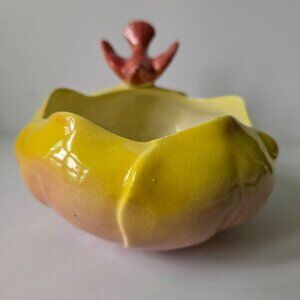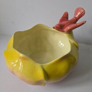 Vintage Royal Copley Yellow & Pink Ceramic Planter Bowl With Bird Accent