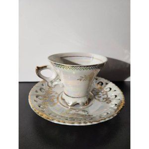 Lovely cup and saucer made by Royal Crown. The cup and saucer depicts a Victorian print with reticulated design in the saucer. Tea cup is footed