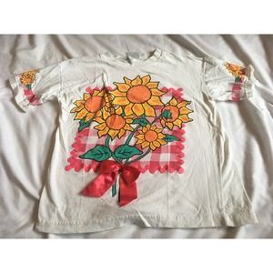 Vintage Royal Deb Girls White Sunflower Bouquet Graphic Tee Shirt 14 90s Bow