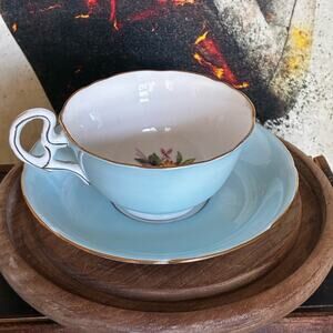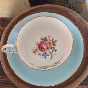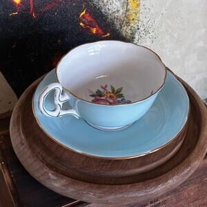 Elegant teacup and saucer set with floral design. Features a light blue exterior and white interior with colorful flowers.