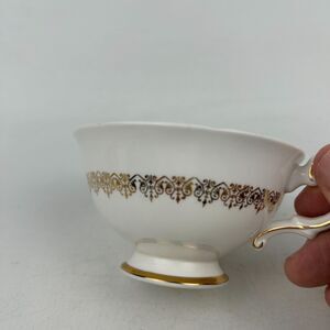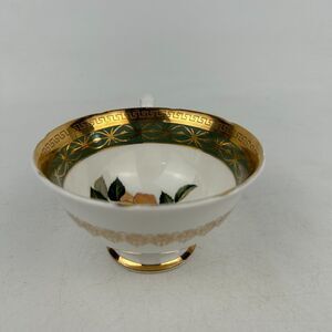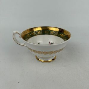 This Vintage Royal Grafton Tea Cup is a beautiful piece crafted in England from Bone China. Adorned with a multi-floral design and heavy gold trim, this round tea cup exudes an Art Deco style that is perfect for any occasion. The glossy finish and decorative features make it a unique addition to any collection of decorative cookware or dinnerware. With its printed backstamp and intricate design, this tea cup reflects the artistry and craftsmanship of pottery production in the United Kingdom.