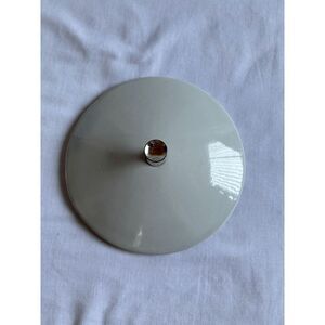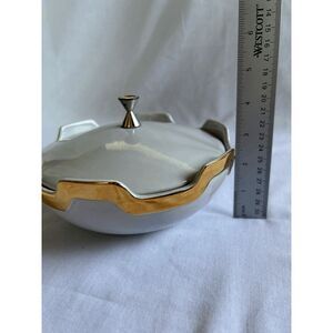 This piece of pottery by Royal Haeger is in great condition with no cracks or chips in it. It is gold rimmed with a silver handle on the lid. It measures about 7 inches across and 4 inches high. Perfect for a unique candy dish or for decoration.