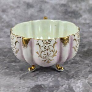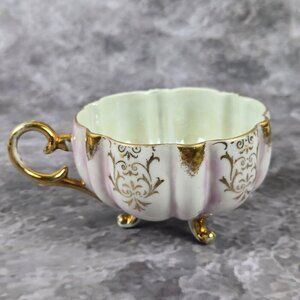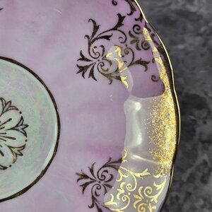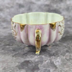 Lusterware tea cup and saucer made of fine bone china. The cup has a fluted, shell body and three feet. The exterior of the cup is a pale pink with gold accents; the interior is a white iridescent. The handle is gold. The saucer has a gold accented scalloped rim with pink leading to the white iridescent center. There is some color loss consistent with the age of the item. Made in Japan.