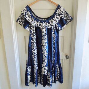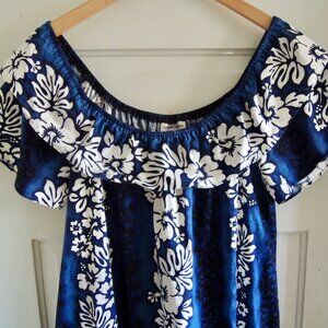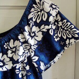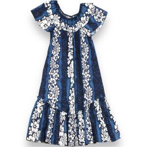 Vintage Royal Hawaiian Creations blue & white ruffled Luna muumuu maxi dress, size Large. Classic muumuu is blue with white floral print and features a round, elasticized neck that can be worn on or off-shoulder, wide ruffle detail at neck, short sleeves, full A-line design, 1 generous side pocket, and deep ruffle hem. Comfortable 100% cotton, ideal for pool, beach, with a tropical, island vibe. Made in Hawaii. EUC, like new.