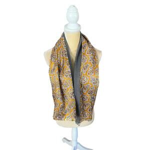 Royal Scot scarf, wool; approximately 10.75 inches x 49 inches. 100% Zephyr wool; gray side is wool; mustard color with paisley print feels like a silk or synthetic blend.