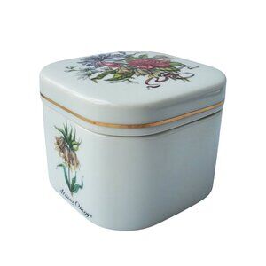 This rare Royal Secret Porcelain Bath Foam Cache by Germaine Monteil is a beautifully preserved collectible from the early 1980s, complete with its original gold presentation box, informational card, and unused sealed contents. The porcelain jar features the “Garden of Delight” floral design, made in Japan exclusively for Germaine Monteil, and is marked African Orange on the side. After the luxurious bath powder is gone, the elegant 3.5" x 4.5" x 4.5" container can be repurposed as a trinket box or vanity jar.