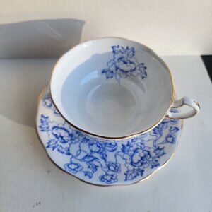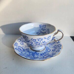 This set features a distinctive blue floral pattern on a white background, accented with gold trim.
