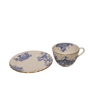 Made in England, this set features a stunning blue dragon design with white accents, fluted rim and elegant gold trim. This Chinoiserie style adds a touch of timeless elegance.