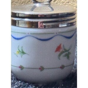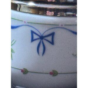 Stylish and functional, this small vintage container features a porcelain base adorned with delicate floral and bow patterns.
