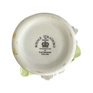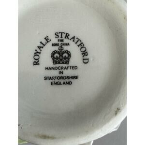 Excellent preowned vintage condition with no chips that the seller can see or find this darling tiny bowl full of three beautiful flowers is created by hand by artisans at Royale Stratford. Made in England, there is a yellow flower a pink rose and a blue and white flower surrounded by green leaves and placed in a pretty white tiny bowl. The entire thing measures approximately 3 inches tall, the base is approximately 2 inches in diameter and the top is approximately 4 inches in diameter . The manufacturer is stamped on the base. Fine bone china.