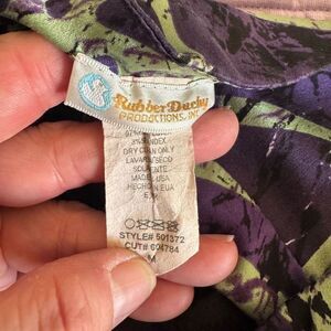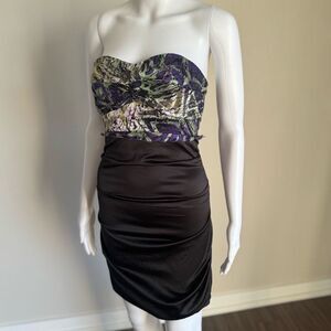 Vintage rubber duck productions strapless satin ruched dress with abstract design, back zip, size M, fits like XS, pit~pit 14”, length 27”, good vintage condition