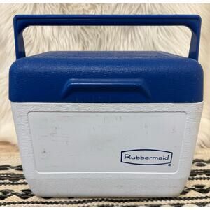 Classic Rubbermaid blue and white hard-shell cooler, perfect for picnics, camping, or display in a vintage-inspired garage or retro kitchen. This small, sturdy cooler features a swing-up handle, embossed lid detail, and original Rubbermaid logo on the front.