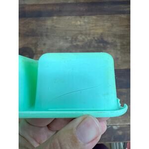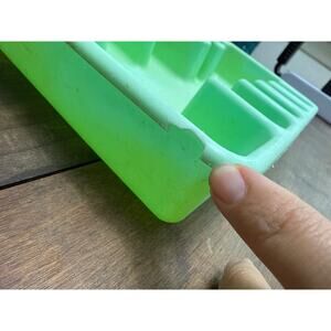 Vintage green silverware organizer made by Rubbermaid. There is a chip to the corner. There is a crack in the plastic on the left top side and near the spoon slot as pictured. This is in-between a hard and a soft plastic, so it kind of forms back together and isn’t noticeable especially once in a drawer. I had to bend the plastic to show the cracks. It looks a little bit dingy in spots, and there’s some faded areas, but I have given it a good scrub. Great vibrant piece for any vintage themed kitchen.
