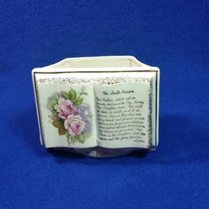 This beautiful planter features an open book with pinkish purple roses with greenery on one side and The Lord's Prayer written out in gold letters on the other side.
