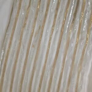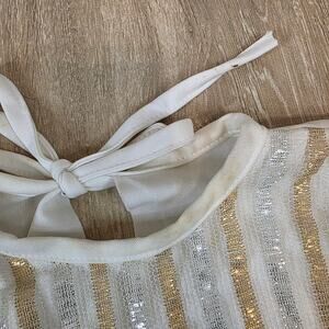 Features shimmering gold and white sequin striped detailing on the front and a tie-back neckline.