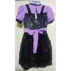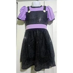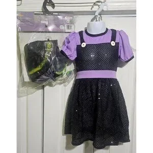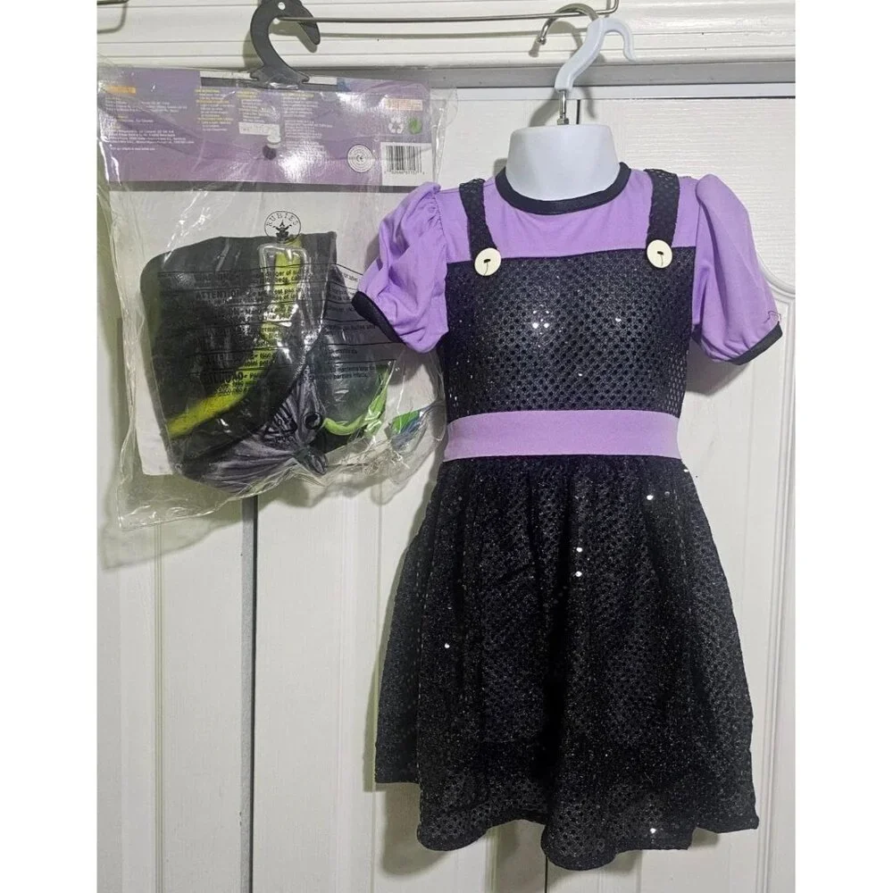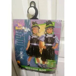 This is an adorable Rubie's vintage toddler costume. It is part of the "Tiny Monsters" collection. It includes a beautiful sequin jumper dress with attached purple top, a purple sash, and a rubber witch hat with purple rubber hair and a soft velvet chin strap. The hat has some marks on it (see photos). It comes in its original package.