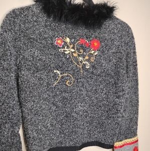 Vintage Ruby Cho Feather Trim Floral Embroidered Cardigan Sweater Holiday Artsy