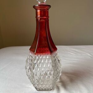 vintage glass decanter, ruby red barware, diamond point glass, vintage glass bottle, mid century glass decanter, red and clear glass, retro cocktail bar decor, ruby red collectible, vintage stopper decanter