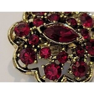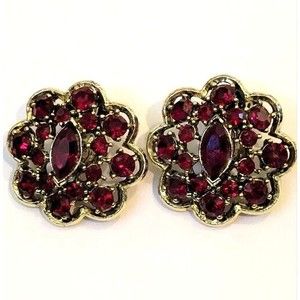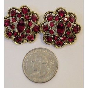 Vintage Ruby Red Rhinestone Scallop Edge Yellow Gold Tone Clip on Earrings