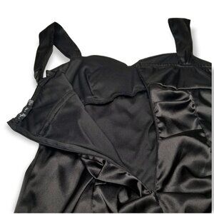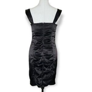Black satin bodycon dress with ruching down the center. Sleeveless. Mini Length. Zips in the back.