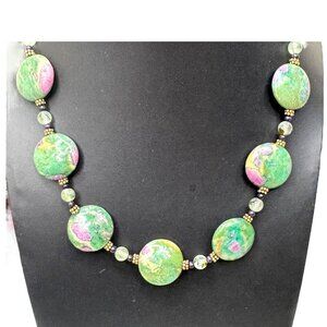 Elevate your style with this captivating vintage necklace, featuring stunning ruby zoisite beads known for their unique combination of rich green and vibrant pink hues. Each bead is carefully polished, enhancing its natural beauty. The necklace is elegantly finished with a gold plated clasp, making it a versatile addition to any jewelry collection.