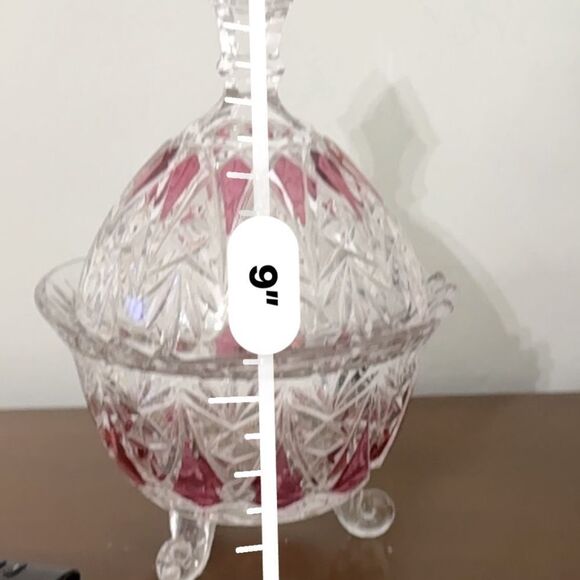 Beautiful vintage ruby red and clear cut glass covered candy dish with ornate pointed lid. This footed pedestal dish features intricate starburst and diamond patterns with rich ruby red accents. Measures approximately 9” tall with lid. Perfect for candy, trinkets, or as a stunning display piece in your home.