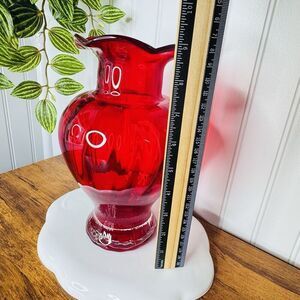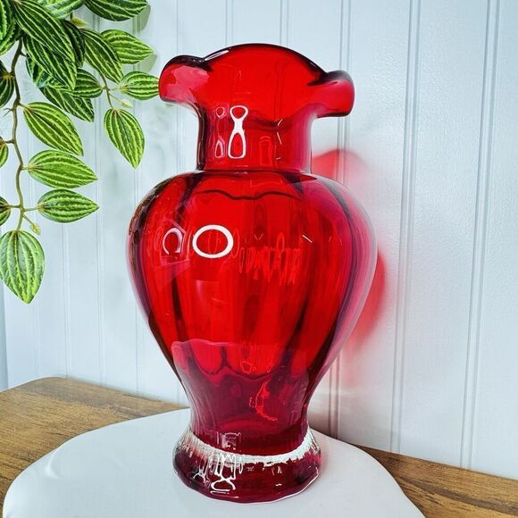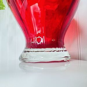 This vintage glass vase bowl is a beautiful piece of artwork that is perfect for adding a touch of elegance to your home decor. The ruby red color is stunning and will definitely catch the eye of anyone who sees it. The ruffled ribbed melon design is unique and gives this vase a one-of-a-kind look that is sure to impress.