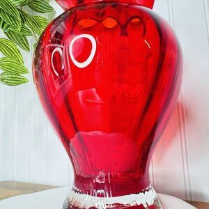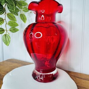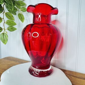 Vintage Ruby Red Glass Vase Bowl Ruffled Ribbed Melon Heavy BEAUTIFUL 9.25”