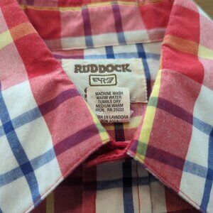 This vintage Ruddock Western shirt features a timeless plaid pattern and pearl snaps. Its classic fit celebrates Western heritage and durable craftsmanship.