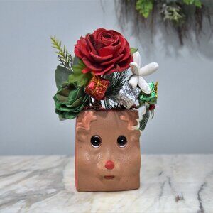 Vintage Rudolph shaped painted pottery with Sola Woods Flower Christmas Holiday