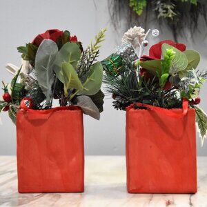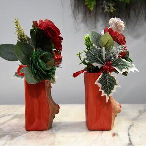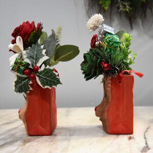 THIS LISTING IS FOR ONE OF THE TWO SHOWN. These delightful clay containers were part of an estate that includes items from their florist and vintage store. They have a fabric ribbon for hanging or can sit flat on a table or shelf. Each comes from the same mold but have slight difference in paint colors etc. Both have a red nose! These two are filled with *Sola wood "skin" (bark) flowers dyed in red and green and a white flower made from raw (no bark) *Sola wood. Sold separately. *Sola wood comes from a tapioca plant root called Cassava (a.k.a. manioc, arrowroot, yucca). This woody shrub can be dried down to a powder to create tapioca. Since Cassava is native to tropical climates, it is extremely drought resistant. Sola wood flowers are sustainable and naturally recyclable, the dyes are natural, the white and skin flowers are actual soft wood. Some natural wood flowers often have small rips or tears or natural spots in the wood. Please view photos - these bouquets look beautiful and any natural tears are not obvious.