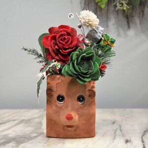 Vintage Rudolph shaped painted pottery with Sola Woods Flower Christmas Holiday
