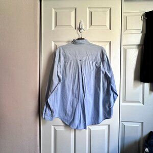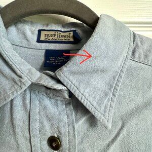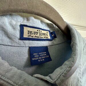 Vintage Ruff Hewn Men's Size Medium Light Wash Denim Chambray Button Up Shirt with a detailed embroidered horse racing scene across the front.