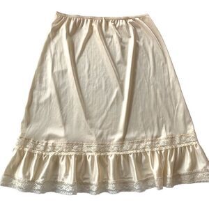 Vintage ivory colored lingerie slip skirt with a ruffled hem. Made of nylon. Has some minor wear, no major flaws.
