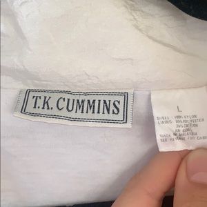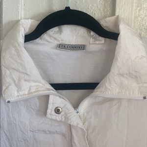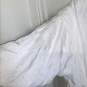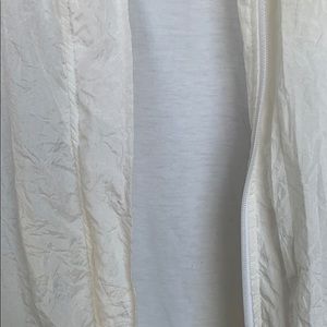 VINTAGE white windbreaker with amazing ruffled sleeves. Lined with super soft material, this jacket has elastic gathering around the wrists and waist. Zipper closure with silver buttons on the top and bottom.