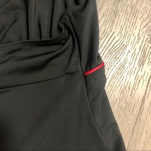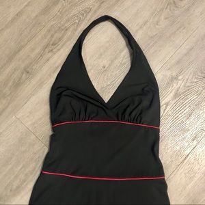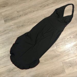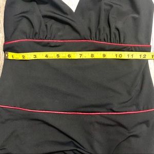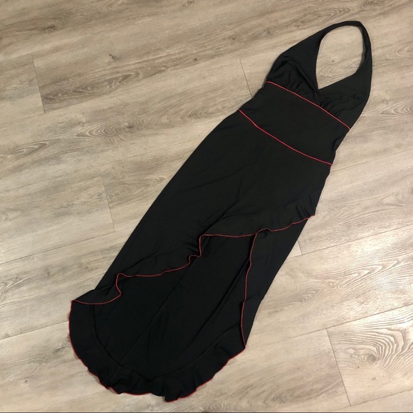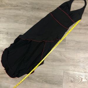 Pre-loved salsa dance dress by Frederick’s of Hollywood. Dramatic, sleeveless, plunging neckline and thigh-high split is a head turner for sure! Ruffle, asymmetrical red-trimmed hem line. Polyester and spandex blend ensures it hugs all the curves. See photos for measurements and small flaws to front and back. Open to offers.