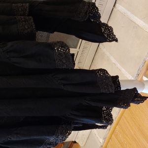 Vintage 70s black triangle shawl with a big lace ruffle. no tags but it looks/feels like cotton or a cotton blend. could have been hand made. VERY witchy Stevie Nicks. I've got to say that I don't mind keeping this one if it doesn't sell. Approx 76" long. 6" ruffle. Excellent vintage condition.