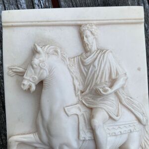 This vintage Italian sculpture by Ruggeri features Marco Aurelio and a horse. The ivory color and intricate details give it a classic, vintage look.