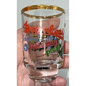 All six glasses are in very good condition, no chips or cracks and graphics are still bright and nice. The box gas some staining, please see photos. The Vintage Ruhrglas Schnapsglaser Kasino Mit Dekor Schnapps Glasses Gold Rim set includes six round shot glasses made of glass with a gold rim. These collectible shot glasses are from the 1960s and are original pieces by the Ruhrglas brand. Made in Germany, these shot glasses are a stylish addition to any barware collection, perfect for enjoying shots with friends and family. The set weighs 2lbs and is a must-have for collectors of vintage glassware.