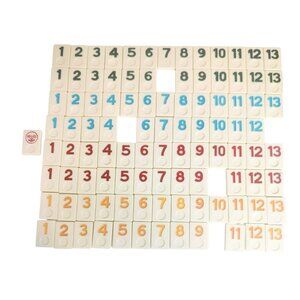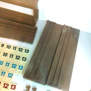 Vintage Rummikub International Game Faux Wood Box Made in Israel - 98 Tiles. Condition is preowned. There are 98 tiles and 1 tile leg is missing. (PM04)