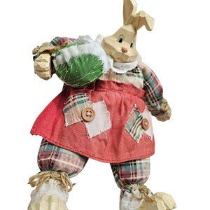 In a quaint corner of the world, resides this charming vintage bunny, lovingly fashioned with a wooden face and paws that capture whimsy in every curve. Her plaid ensemble, coupled with a vibrant red dress, adds an enchanting touch reminiscent of simpler times. Her presence, adorned with buttons and patches, evokes nostalgia's gentle embrace.