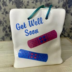 Small ceramic planter in the shape of a gift bag, featuring pink and blue adhesive bandages (Band-aids) with hearts on them. At the top it reads "Get Well Soon". Teal string "handles" adorn either side of the bag.