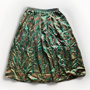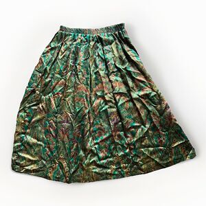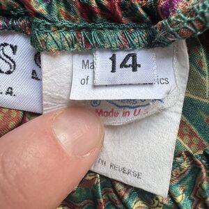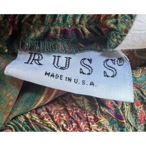 This vintage Russ pleated midi skirt in size 14 is a charming piece with a floral pattern in fall jewel tones, perfect for various occasions such as travel, weddings, parties, and more. Made in the USA, this ILGWU Union Made vintage skirt features a pull on, elastic waist, pleated accents, and a knee-length style. Made from a blended fabric, this skirt is lightweight and suitable for all seasons. The multicolor design with a fall floral pattern adds a touch of 80s preppy flair to any wardrobe.